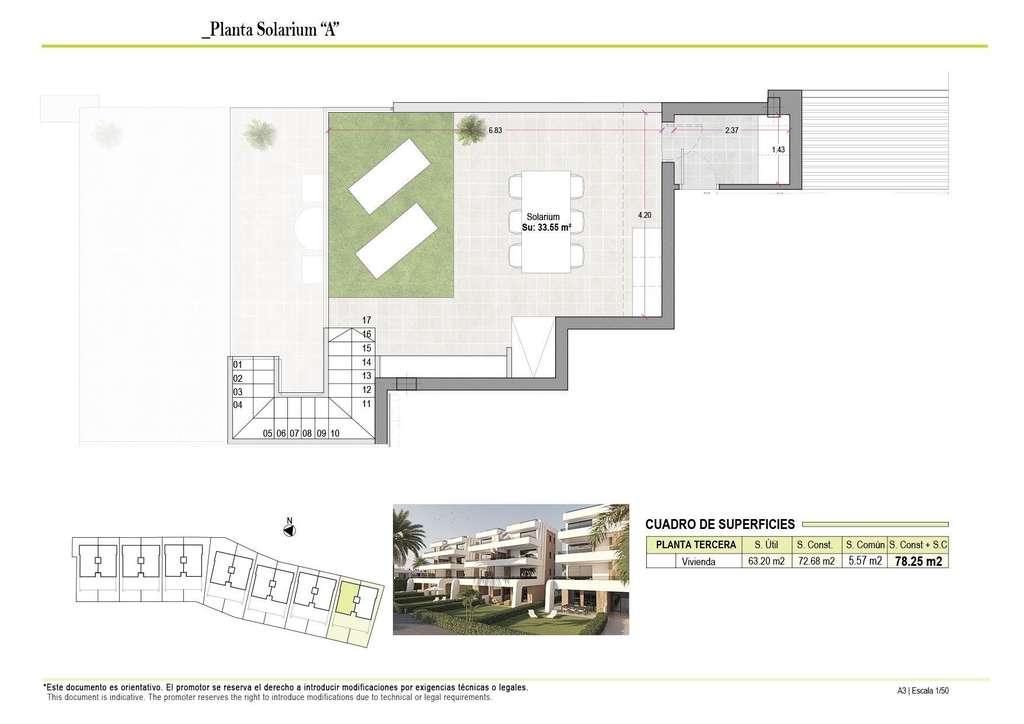 Las propiedades de la planta baja ofrecen 3 dormitorios y 2 baños completos, con la opción de adaptarse a 2 dormitorios para obtener una zona de estar más amplia si se desea. Las demás unidades cuentan con 2 dormitorios y 2 baños. Los apartamentos de la última planta incluyen un solárium privado, perfecto para tomar el sol y disfrutar de vistas panorámicas.
