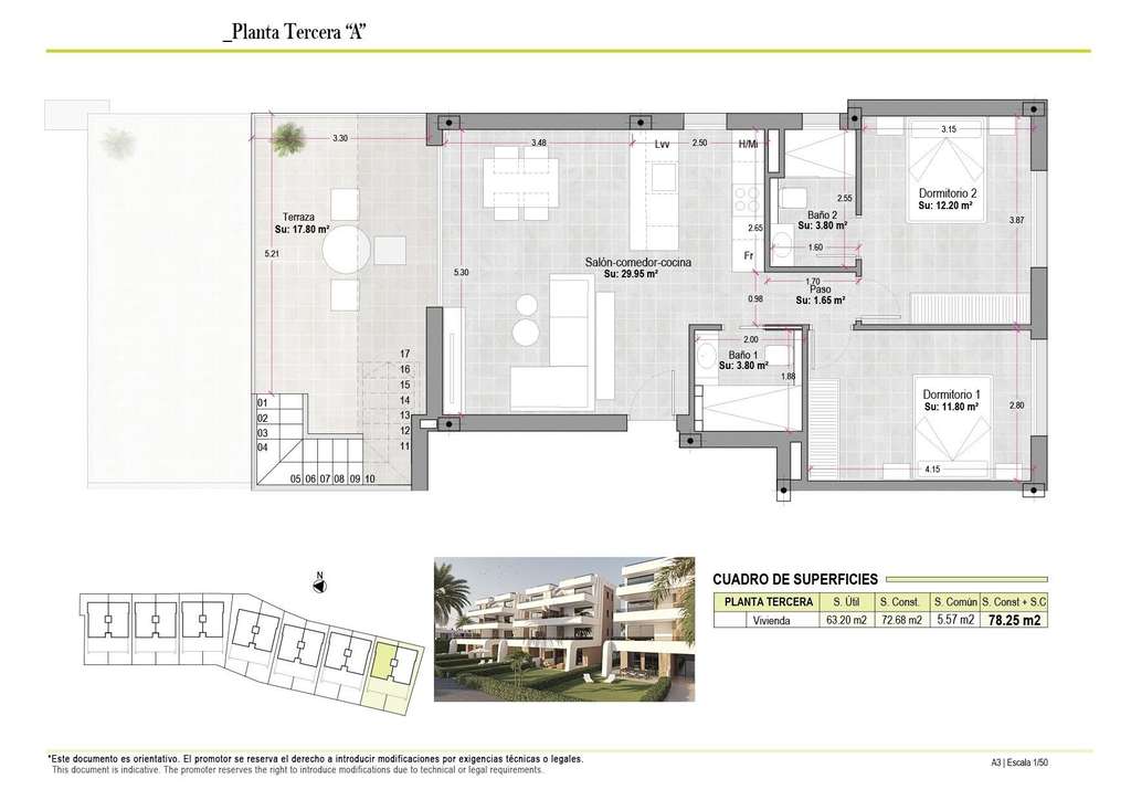 Las propiedades de la planta baja ofrecen 3 dormitorios y 2 baños completos, con la opción de adaptarse a 2 dormitorios para obtener una zona de estar más amplia si se desea. Las demás unidades cuentan con 2 dormitorios y 2 baños. Los apartamentos de la última planta incluyen un solárium privado, perfecto para tomar el sol y disfrutar de vistas panorámicas.
