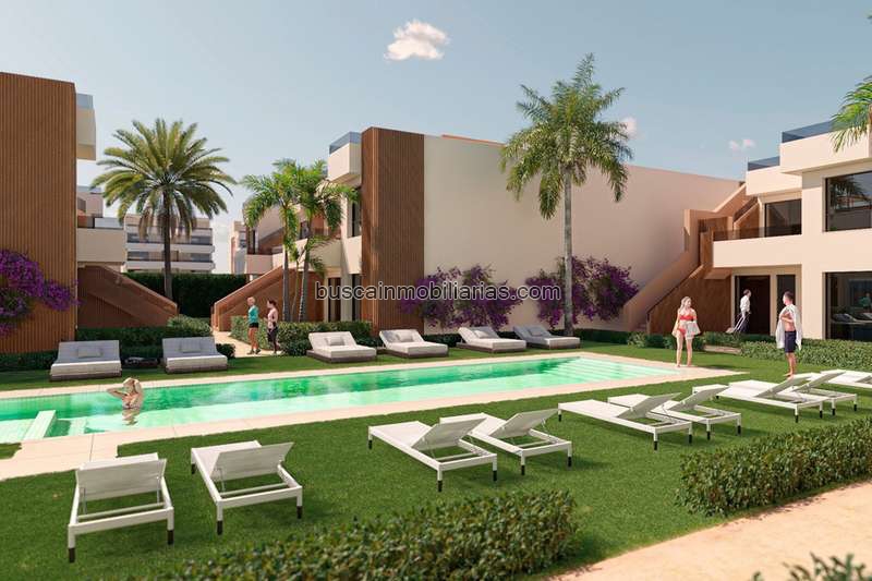 Aislamiento acústico y térmico según normativa.Cocina de verano en solárium (bungalows planta alta).Carpintería exterior de aluminio en color antracita con doble vidrio y persianas eléctricas.Fachada de mortero monocapa blanca y cerámica imitación madera.Pavimento de gres en toda la vivienda, baños alicatados con azulejos de gran formato.Sanitarios Roca o similar suspendidos, duchas empotradas con grifería negra.Iluminación interior y exterior incluida, excepto lámparas decorativas.Electrodomésticos incluidos: frigorífico, placa de inducción, horno, microondas, campana y lavavajillas.Muebles de cocina antracita con encimera porcelánica.Agua caliente sanitaria por aerotermia.Preinstalación de aire acondicionado por conductos.Armarios empotrados forrados con cajoneras y baldas.Puerta de acceso acorazada con cerradura de seguridad.Tomas de TV, teléfono, agua y corriente en terrazas y solárium.
