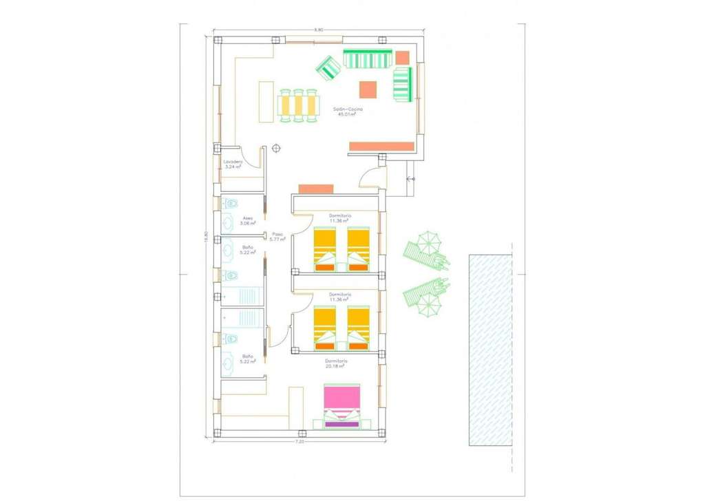 Las villas están diseñadas en una sola planta con zonas de terrazas a su alrededor y disponen de 3 dormitorios, incluyendo vestidor en el dormitorio principal, 2 baños y un aseo.