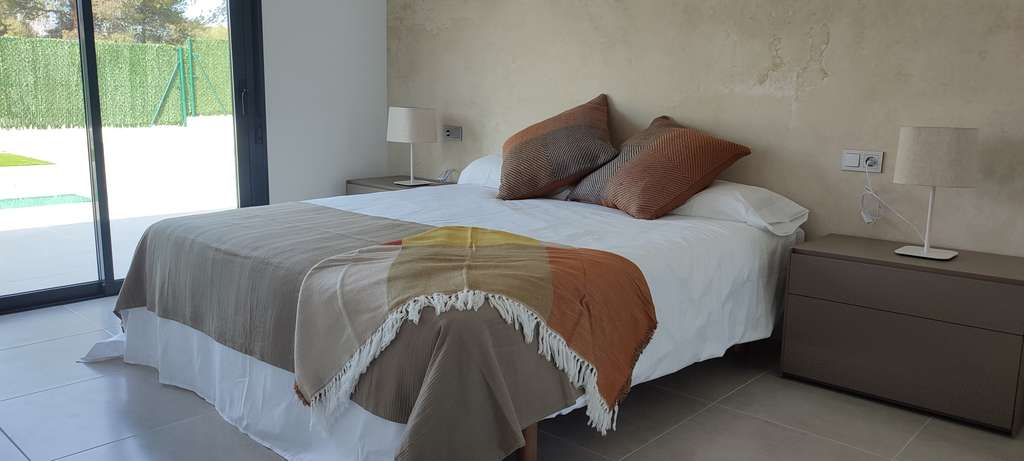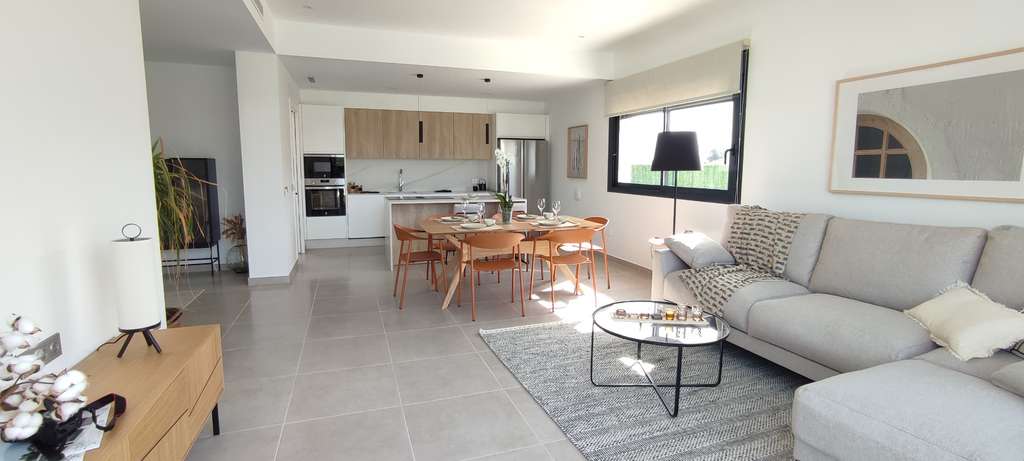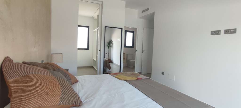 Cada villa está cuidadosamente diseñada en una sola planta, con amplias terrazas alrededor. Esto le permitirá disfrutar del sol radiante y del encanto mediterráneo a cualquier hora del día. Las viviendas cuentan con tres cómodos dormitorios, el principal con vestidor, dos elegantes cuartos de baño y un aseo adicional para invitados. Su nuevo hogar está equipado con una moderna cocina que incluye todos los electrodomésticos necesarios, iluminación ambiental, armarios empotrados con cajoneras, baños totalmente equipados y aparcamiento privado. Para su comodidad, el aire acondicionado ya está preparado.
