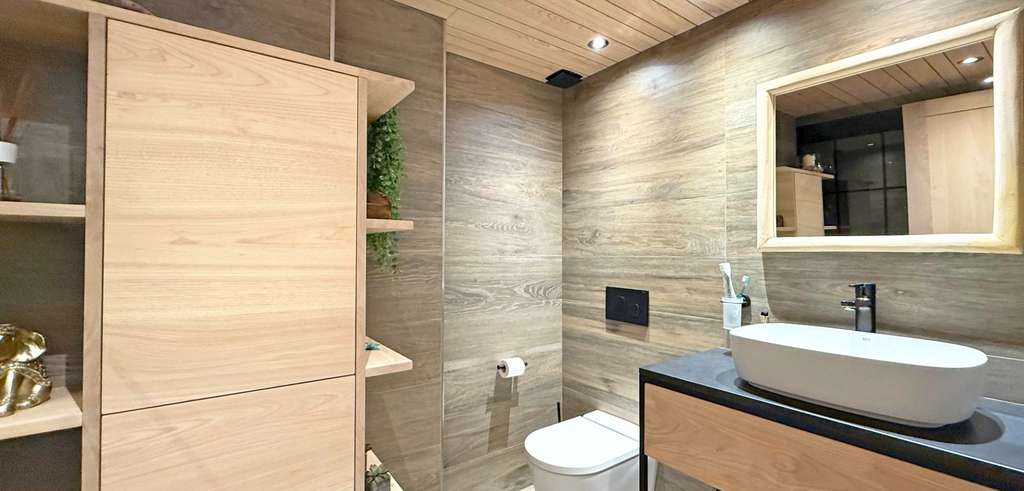 En el interior destacan los acabados exclusivos en madera de castaño, un detalle poco común que aporta calidez y sofisticación. Un lujoso jacuzzi invita a relajarse, mientras que el aire acondicionado garantiza confort todo el año.