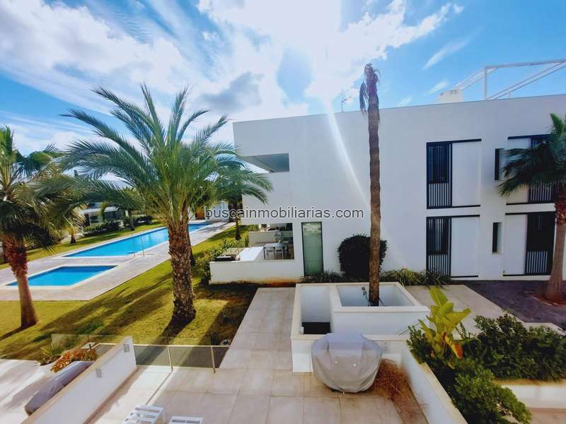 Cuenta con un espacioso salón-comedor que se abre a una terraza y a un solárium con vistas a la piscina y jardines. La cocina de diseño contemporáneo, equipada con una elegante isla, se entrega completamente amueblada e incluye electrodomésticos. La vivienda dispone de climatización por conductos en todas sus estancias, dos dormitorios y dos baños, destacando el dormitorio principal en suite con baño privado y vestidor. Además, cuenta con zona de lavadero, armarios empotrados y carpintería exterior con ventanas de doble acristalamiento tipo Climalit.