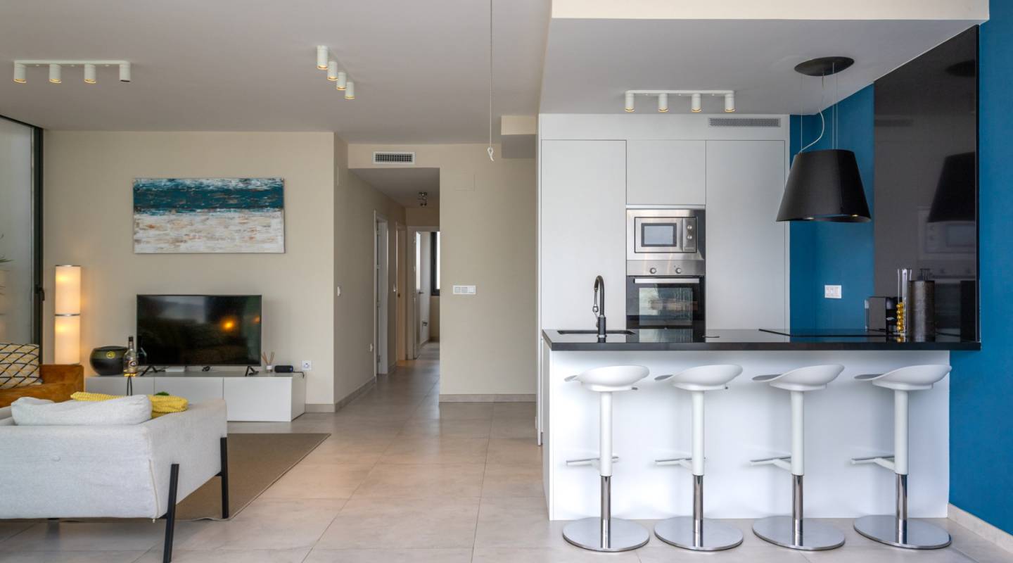 La cocina abierta, totalmente equipada con todos los electrodomésticos necesarios y barra americana, es perfecta para reuniones y comidas informales.
