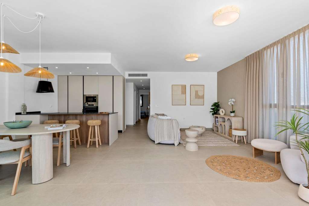 Los apartamentos tienen un diseño moderno, presentando una zona de estar de planta abierta, que combina la cocina, el comedor y el salón, en un gran espacio con acceso a la terraza.
