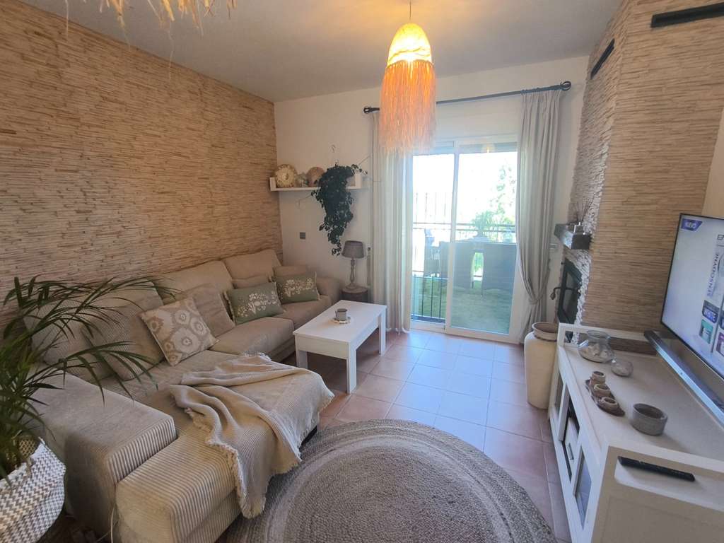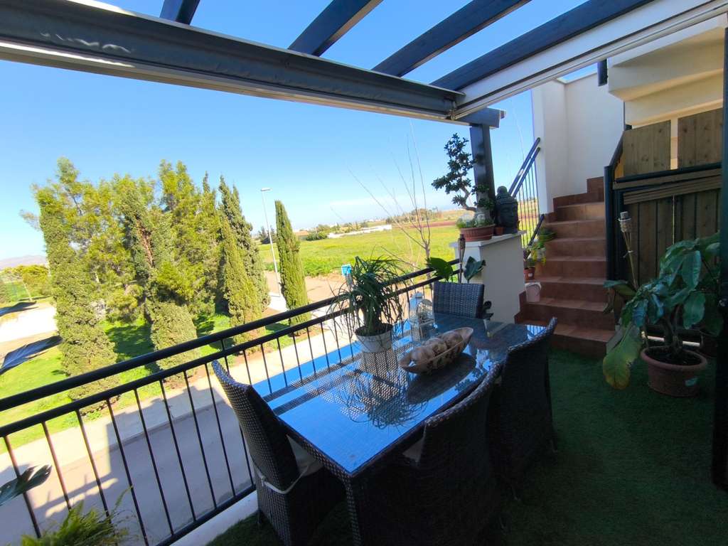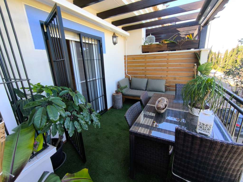 perfectamente acondicionado con toldo superior y vertical, lo que permite disfrutarlo durante todo el año. Este espacio exterior incluye césped artificial, zona de relax y comedor, ideal para reuniones o momentos de descanso.