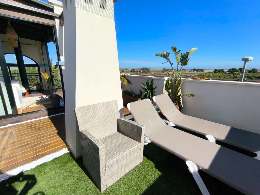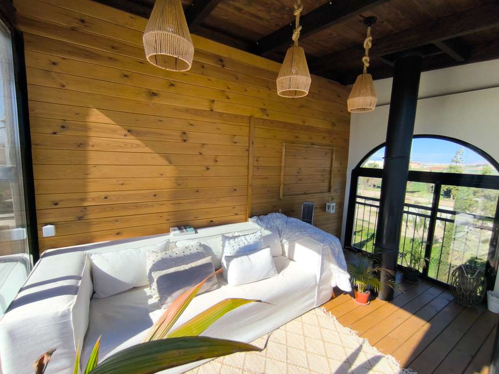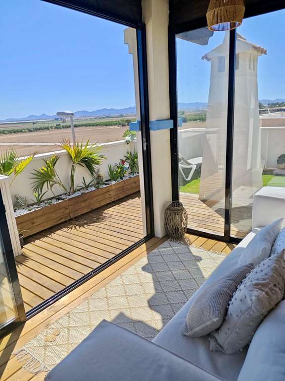 El balcón da paso a un gran solárium con suelos de madera y cerramiento de cristal, donde encontramos una encantadora zona de lectura sobreelevada. Desde aquí se puede disfrutar del entorno natural y de impresionantes vistas al Mar Menor y a La Manga del Mar Menor.