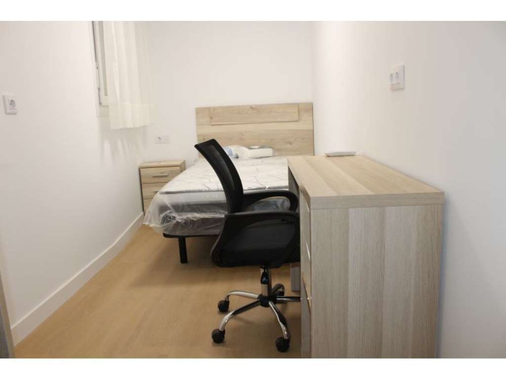 Vivienda en planta baja de un edificio de tres alturas, compuesta por salón con cocina integrada tipo americano, dos habitaciones individuales y cuarto de baño.