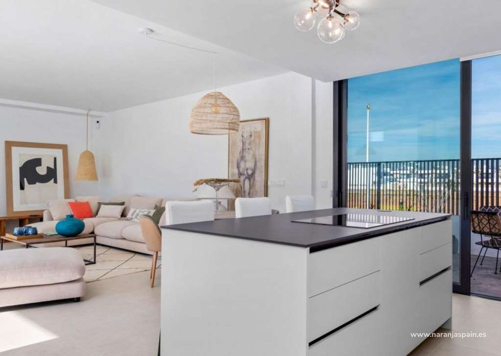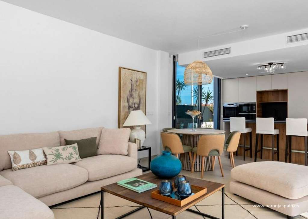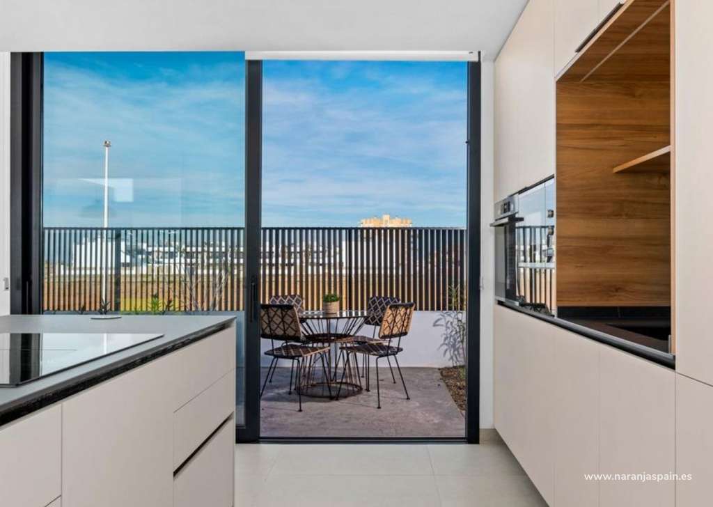 Las villas tienen una moderna cocina abierta con la sala de estar, donde las altas ventanas correderas tiene acceso al jardín con piscina privada y plaza de aparcamiento.