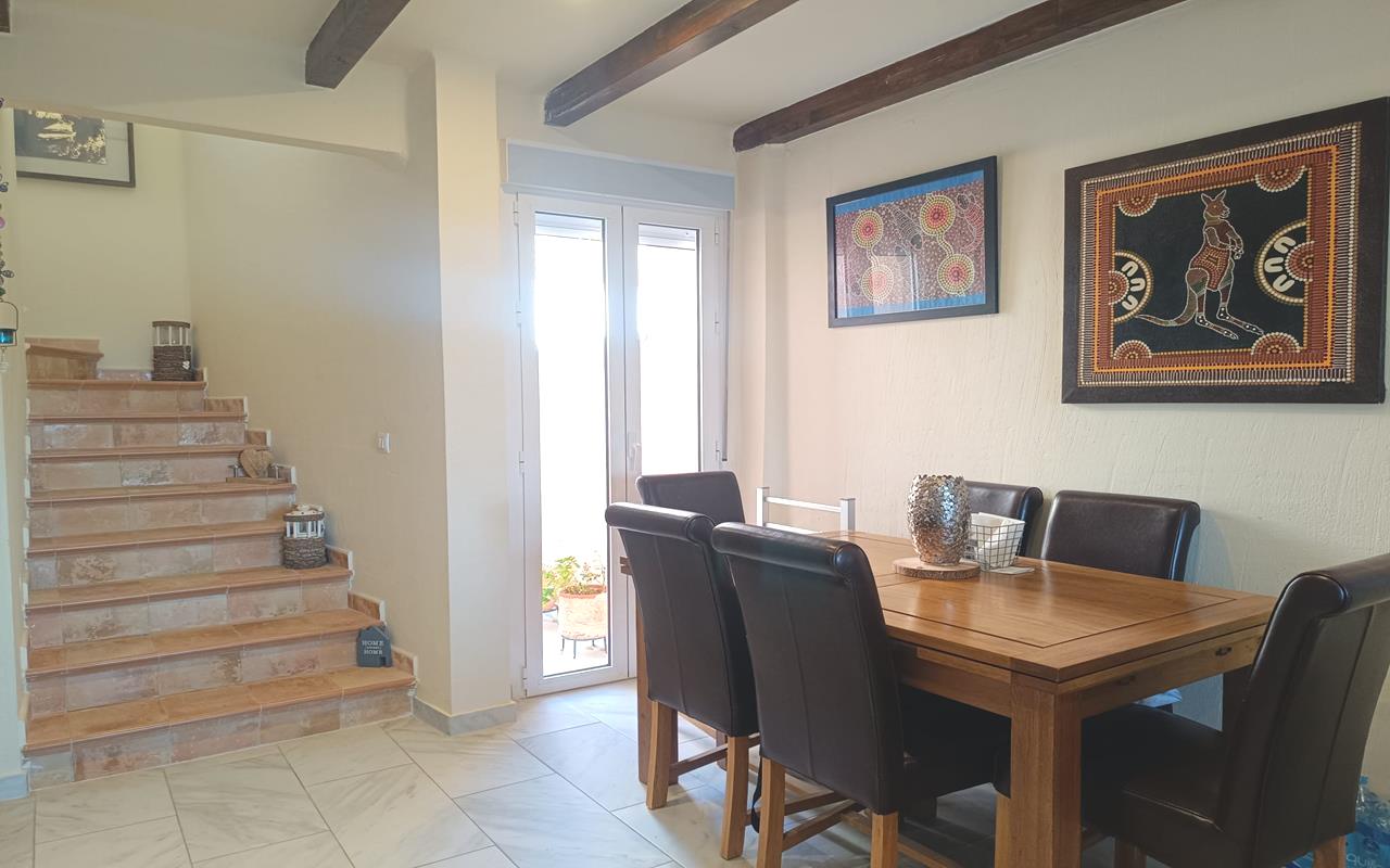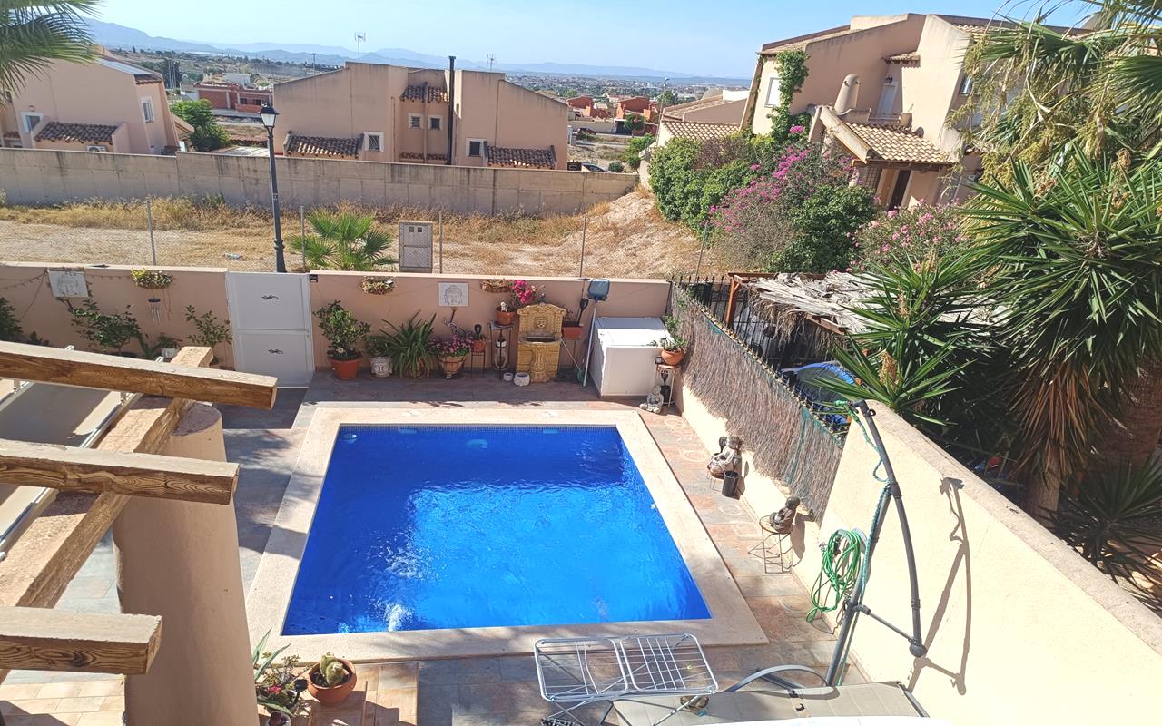 - White Villas in Spain presenta este chalet adosado de 2 dormitorios y 2 baños en una parcela de 220 m² con piscina privada, ubicado en la urbanización Las Kalendas de Fortuna, Murcia.