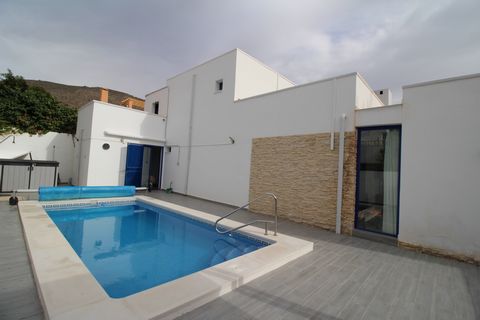 Beautiful modern style villa located in a very quiet residential area 1 km from the spa and 2 kms from the town of Fortuna with all amenities. It consists on the ground floor of a large living room, kitchen and dining room, 2 bedrooms with fitted wardrobes, bathroom and storage. Upstairs there are 2 additional bedrooms, each with terrace and a second bathroom. The outdoor areas are fully tiled for easy maintenance. This beautiful villa has all modern comforts and much more. It is connected to the drinking water network, the electricity network but also has a brand new photovoltaic system with lithium batteries (10KW). There is fiber optic for internet, a heat pump to heat the pool, solar screens on each facade, air conditioning units in all rooms, an extendable terrace cover, a swimming pool tarp (new) , surveillance cameras, It should also be noted that the pool was refurbished 2 months ago. There also is a community pool 200 m away At 25 minutes from the beautiful city of Murcia, 45 minutes from the airport and beaches.
