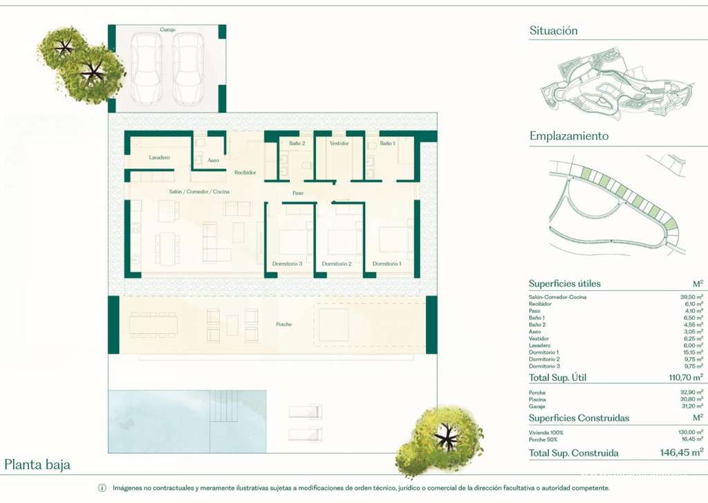 Cada propiedad ofrece una distribución espaciosa con 3 dormitorios, 2 baños y un aseo de invitados, en un diseño de una o dos plantas, según el modelo elegido. Con generosas parcelas a partir de 700 metros cuadrados y una superficie construida de 146 metros cuadrados, estas viviendas ofrecen un amplio espacio para la vida interior y exterior.