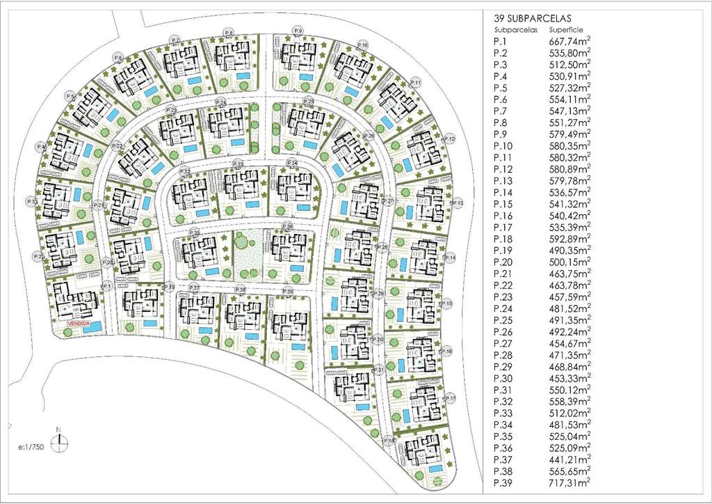 El residencial está compuesto por 39 villas en parcelas a partir de 436 m2. Todas las viviendas cuentan con 3 dormitorios y 2 baños completos en una sola planta, además de una zona de terraza con piscina privada y un solarium privado en la azotea con vistas al campo de golf.