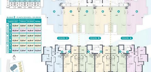 Los bloques de apartamentos ofrecen viviendas de 2 o 3 dormitorios, disponibles en plantas bajas y medias con amplias terrazas o como áticos con soláriums privados. Cada apartamento incluye acceso a un jardín comunitario de estilo mediterráneo y a una gran piscina, perfectos para relajarse y socializar bajo el sol. Las plazas de aparcamiento en un garaje subterráneo y los ascensores en cada bloque añaden comodidad.