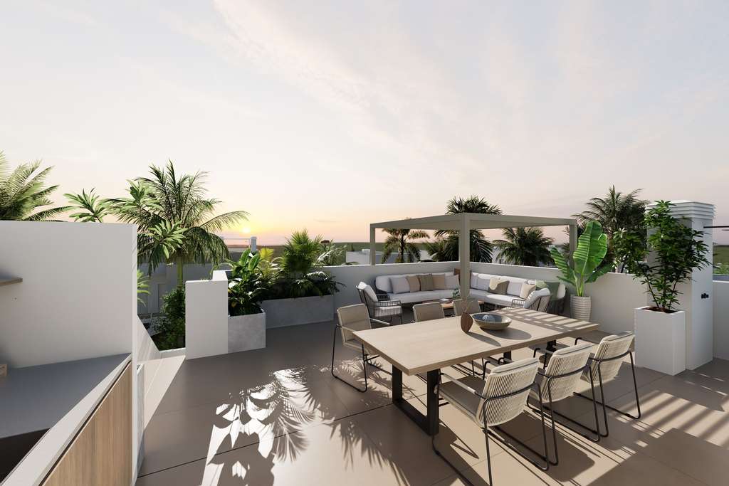 Los exteriores de estos apartamentos/bungalows están pensados para maximizar el disfrute del clima mediterráneo. Cada propiedad cuenta con un jardín privado, perfecto para crear un espacio verde personal o para disfrutar de momentos al aire libre. Además, las terrazas ofrecen un lugar ideal para relajarse, tomar el sol o compartir comidas al aire libre con familiares y amigos. La inclusión de un solárium proporciona un espacio adicional para disfrutar de vistas panorámicas y del sol durante todo el año. Estos elementos exteriores están diseñados para complementar el estilo de vida al aire libre que caracteriza a la región.