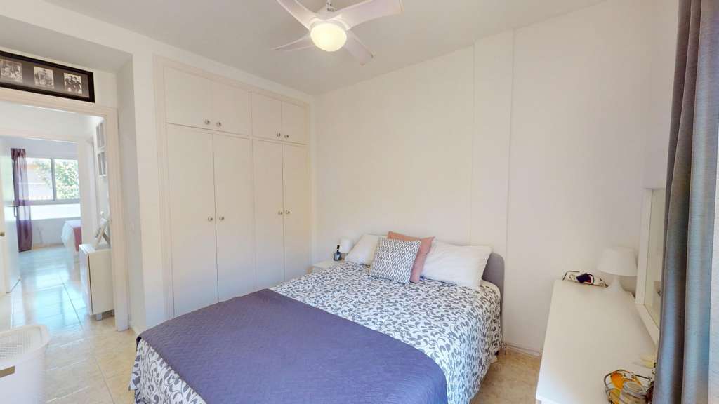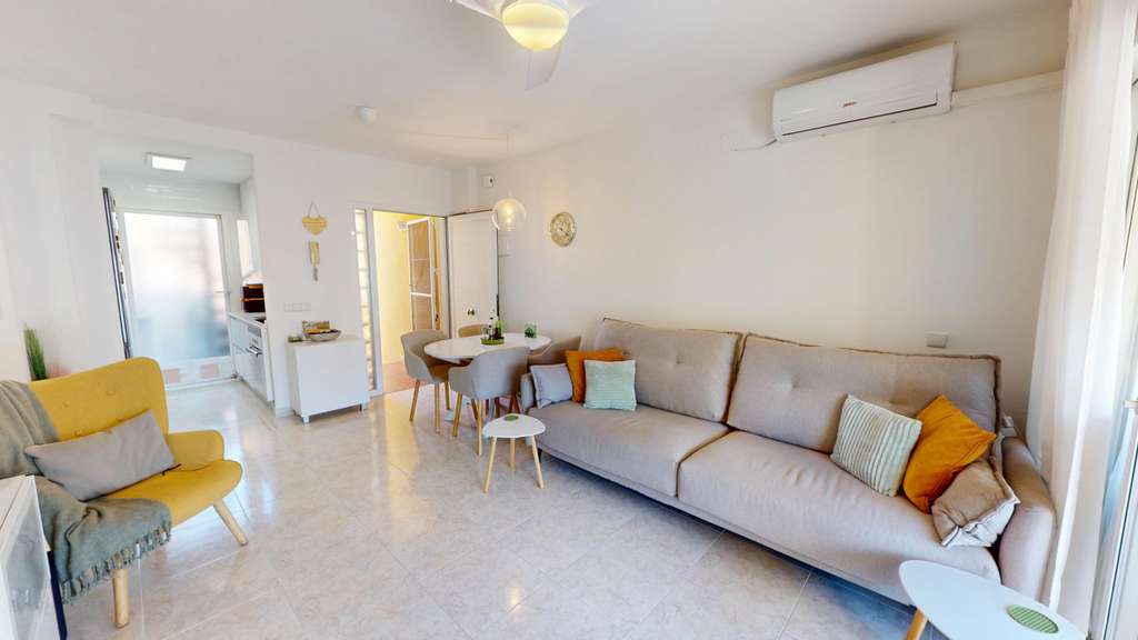 Apartamento listo para entrar a vivir con solárium privado en una ubicación privilegiada en Los Narejos. Este apartamento en primera planta de Los Narejos, impecablemente mantenido, está listo para entrar a vivir. La propiedad ofrece dos dormitorios y un baño reformado. La cocina abierta se integra a la perfección con el comedor y el acogedor salón, que da a una terraza equipada con un práctico toldo. Una escalera de caracol conduce al solárium privado, donde podrá disfrutar del sol español y de las hermosas vistas con total privacidad. El salón cuenta con aire acondicionado frío/calor, y hay ventiladores de techo en todas las habitaciones. Además, la calefacción eléctrica garantiza comodidad durante todo el año. La ubicación es ideal: se encuentra en un barrio tranquilo y agradable, a pocos pasos del popular restaurante Marea y a solo 700 metros de las hermosas playas del Mar Menor. En resumen, este apartamento está perfectamente ubicado, ideal como residencia permanente o casa de vacaciones. No dude en contactarnos para obtener más información o programar una visita.