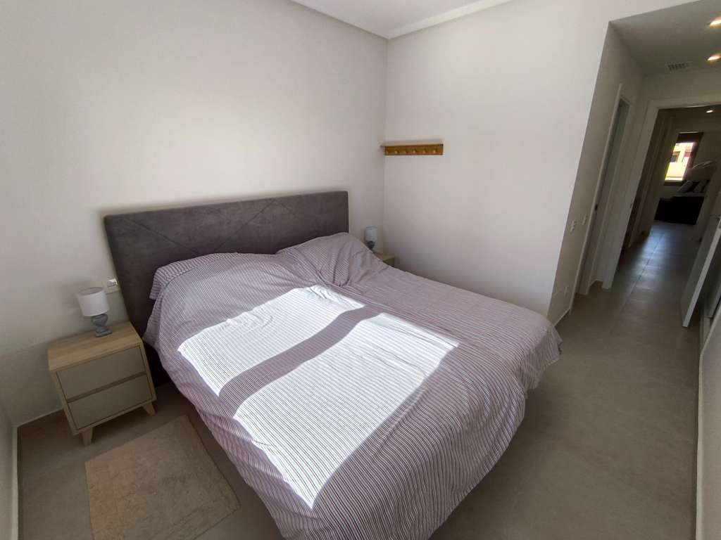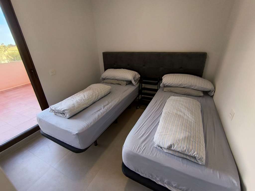 La vivienda cuenta con 3 amplios dormitorios y 2 baños, todos ellos con armarios empotrados, y ofrece privilegiadas vistas a las piscinas comunitarias y al campo de golf desde todas sus ventanas, lo que aporta una sensación constante de amplitud, luz y tranquilidad.