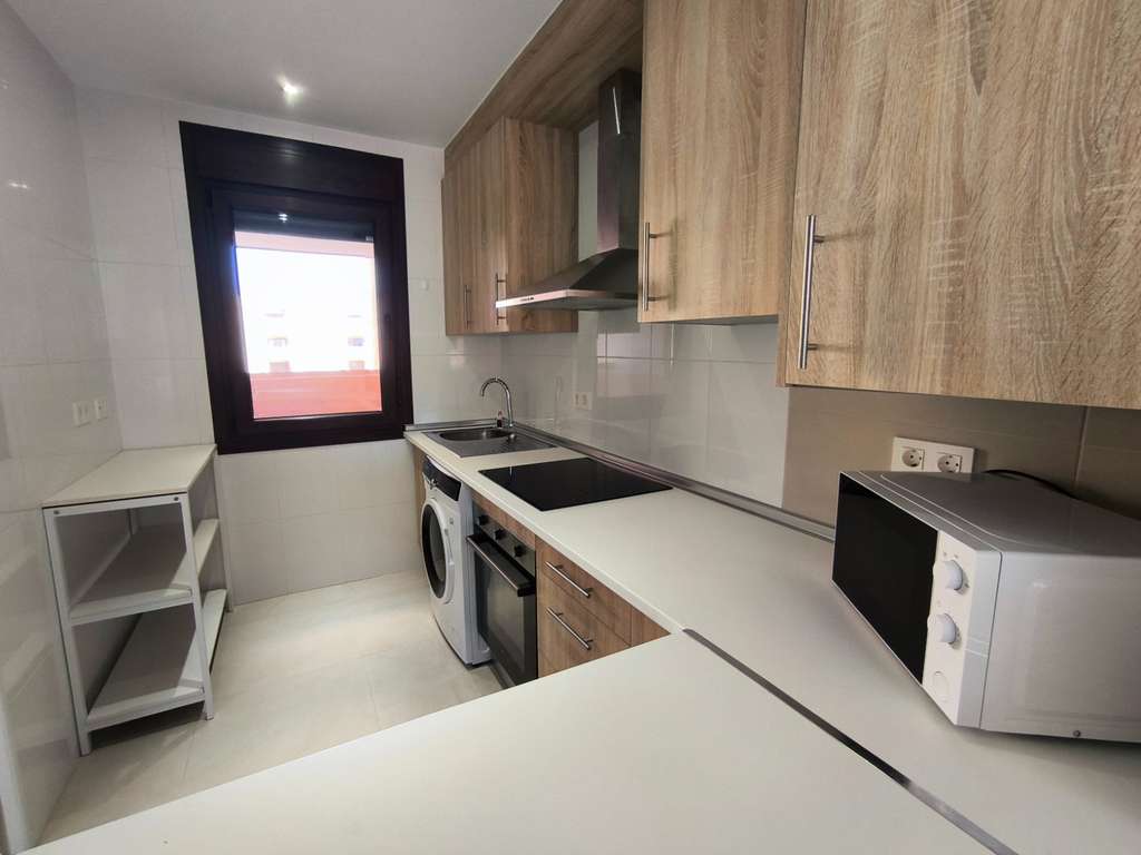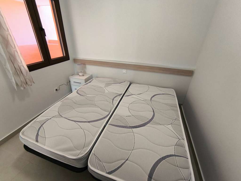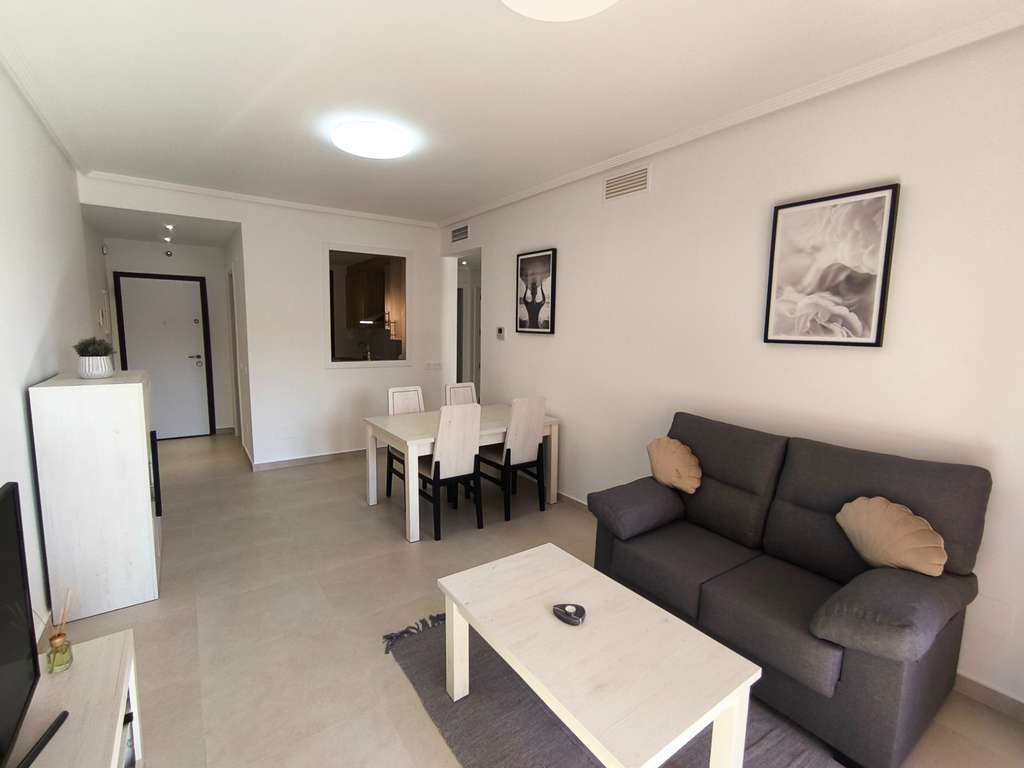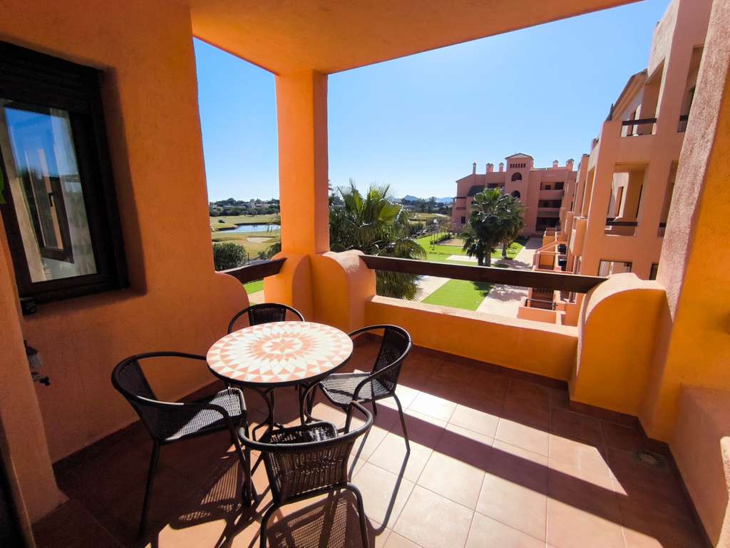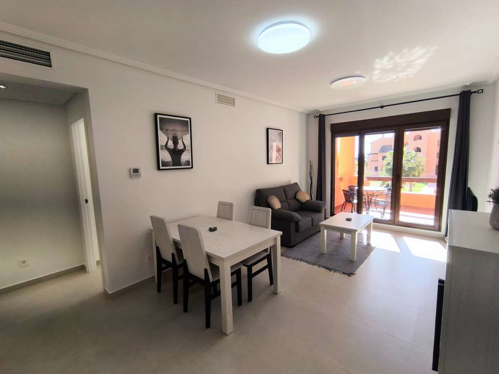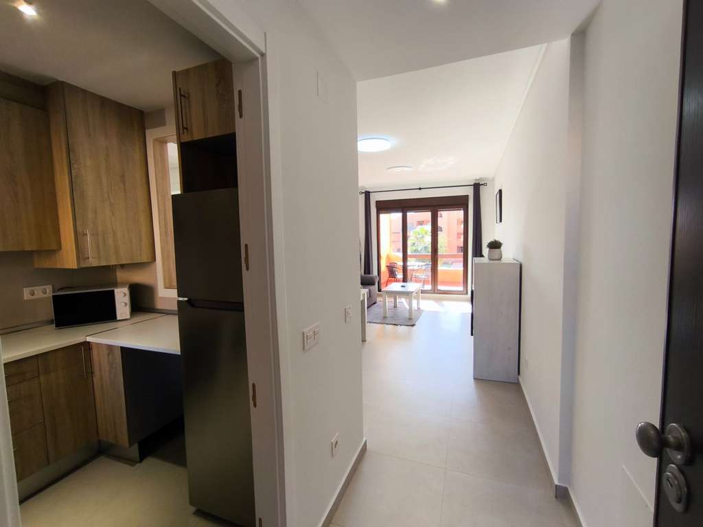 La vivienda cuenta con carpintería lacada en blanco, cocina independiente (la ventana de la cocina al salón no está incluida) y una terraza con vistas al campo de golf y a la piscina.