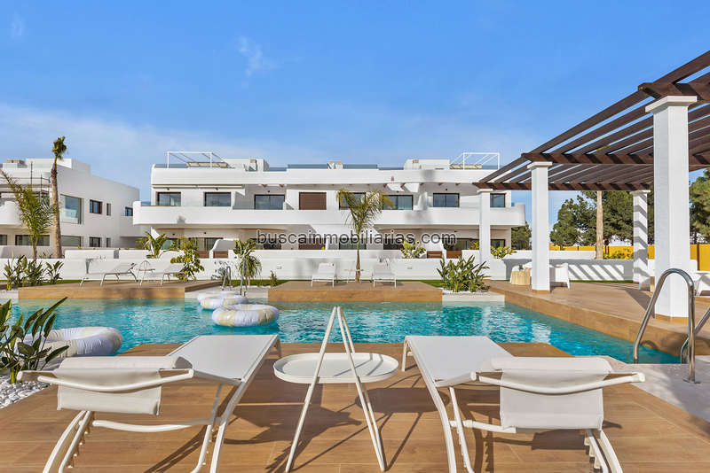 Ubicado en la encantadora localidad de Los Alcázares, este conjunto residencial ofrece una selección de 22 viviendas que incluyen apartamentos y áticos. Diseñado para aquellos que buscan un estilo de vida cómodo y moderno, cada propiedad está cuidadosamente planificada para maximizar el confort y la funcionalidad. Los Alcázares es conocido por su proximidad al mar, con la playa a solo 1 km de distancia, lo que permite disfrutar de vistas impresionantes y un acceso rápido a la costa. Además, los amantes del golf encontrarán un campo a la misma distancia, lo que convierte a esta ubicación en un lugar ideal para los entusiastas de este deporte. El aeropuerto más cercano se encuentra a 44 km, facilitando las conexiones internacionales.Los exteriores de este residencial están diseñados para complementar el entorno natural de Los Alcázares. Las viviendas cuentan con terrazas privadas, perfectas para disfrutar del clima mediterráneo y de las vistas al entorno. Además, algunas propiedades ofrecen la opción de un solárium, proporcionando un espacio adicional al aire libre para relajarse o socializar. Los jardines comunitarios están cuidadosamente mantenidos, ofreciendo un espacio verde donde los residentes pueden disfrutar de la tranquilidad y la belleza del paisaje. La cercanía al mar, a solo 1 km, permite disfrutar de paseos costeros y actividades acuáticas.En el interior, las viviendas están equipadas con características modernas que garantizan comodidad y estilo. Los apartamentos y áticos ofrecen opciones de 2 o 3 dormitorios y 2 o 3 baños, adaptándose a diferentes necesidades familiares. Los suelos de gres porcelánico aportan un toque de elegancia y son fáciles de mantener. Las cocinas están equipadas con electrodomésticos, facilitando la vida diaria. Los armarios empotrados proporcionan un almacenamiento eficiente, mientras que la preinstalación de aire acondicionado asegura un ambiente agradable durante todo el año. Además, se ofrece la opción de adquirir un garaje, añadiendo comodidad y seguridad.Las zonas comunes del residencial están diseñadas para fomentar un sentido de comunidad y ofrecer espacios de recreación y relajación. Los residentes pueden disfrutar de una piscina comunitaria, ideal para refrescarse durante los cálidos días de verano. Los jardines comunitarios ofrecen un entorno verde y sereno, perfecto para pasear o simplemente relajarse al aire libre.