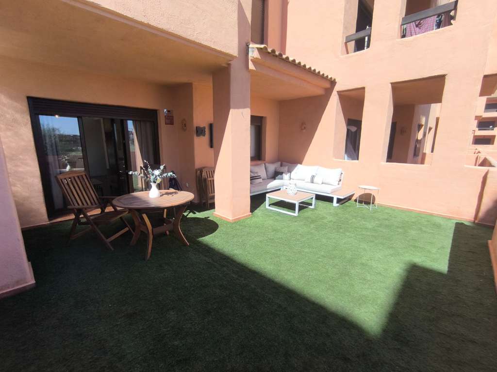 La vivienda se encuentra en planta baja y destaca por sus amplios espacios exteriores. Dispone de 55 m² de terraza privada, distribuidos en dos terrazas: una frontal con vistas al campo de golf