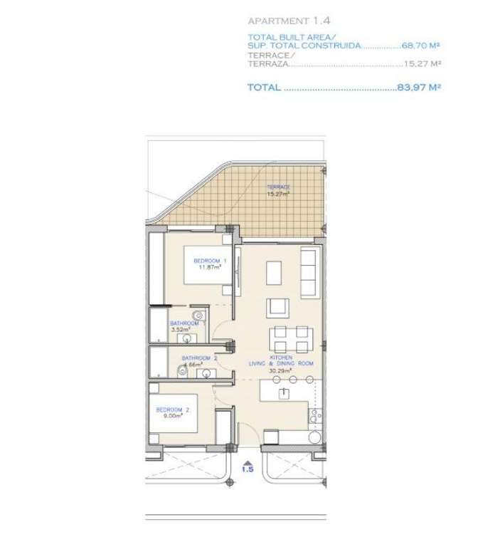 La promoción consta de 13 apartamentos contemporáneos de 2, 3 o 4 dormitorios y 4 villas exclusivas de 3 dormitorios. Los compradores pueden elegir entre apartamentos en planta baja o en planta intermedia con amplias terrazas, o áticos con soláriums privados. Todas las propiedades incluyen una plaza de aparcamiento privada y un trastero en el garaje subterráneo, accesible por ascensor.