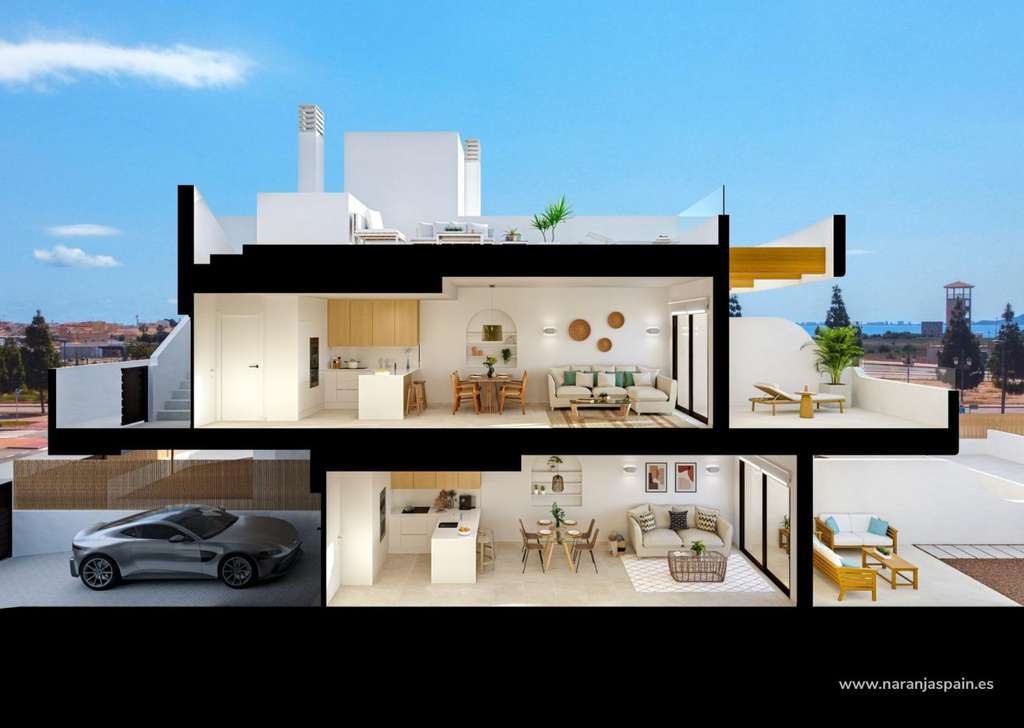 La promoción consta de 29 viviendas modernas de 2 o 3 dormitorios, diseñadas con líneas arquitectónicas limpias y acabados de alta calidad. Los compradores pueden elegir entre apartamentos en planta baja con jardín y terraza privados, viviendas en plantas intermedias con amplias terrazas o áticos con terraza privada y solárium en la azotea con vistas panorámicas. Muchas de las propiedades disfrutan de vistas al campo de golf Serena y al Mar Menor, lo que crea un entorno tranquilo y agradable.