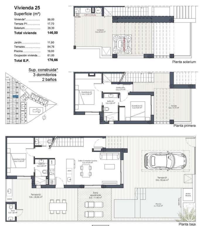 Cada propiedad cuenta con una parcela privada con su propia piscina, lo que crea el entorno perfecto para disfrutar del clima mediterráneo durante todo el año. Las viviendas incluyen 3 dormitorios y 2 o 3 baños, además de aseos para invitados, lo que ofrece espacios cómodos y funcionales, ideales para familias o invitados.