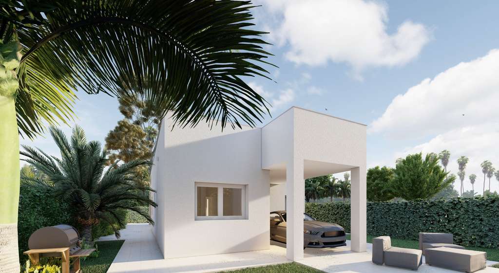 La villa de tres dormitorios y dos baños, uno de ellos en suite, ofrece una moderna cocina totalmente equipada, una amplia terraza en la azotea, un garaje/porche y una piscina privada.