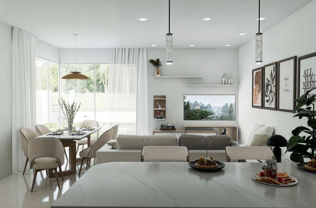 La cocina americana está totalmente equipada con electrodomésticos modernos y conecta con el luminoso salón y el comedor, creando un agradable espacio de vida diáfano. Además, las propiedades ofrecen un confort extra con calefacción por suelo radiante en los baños y conexión de aire acondicionado en toda la casa.