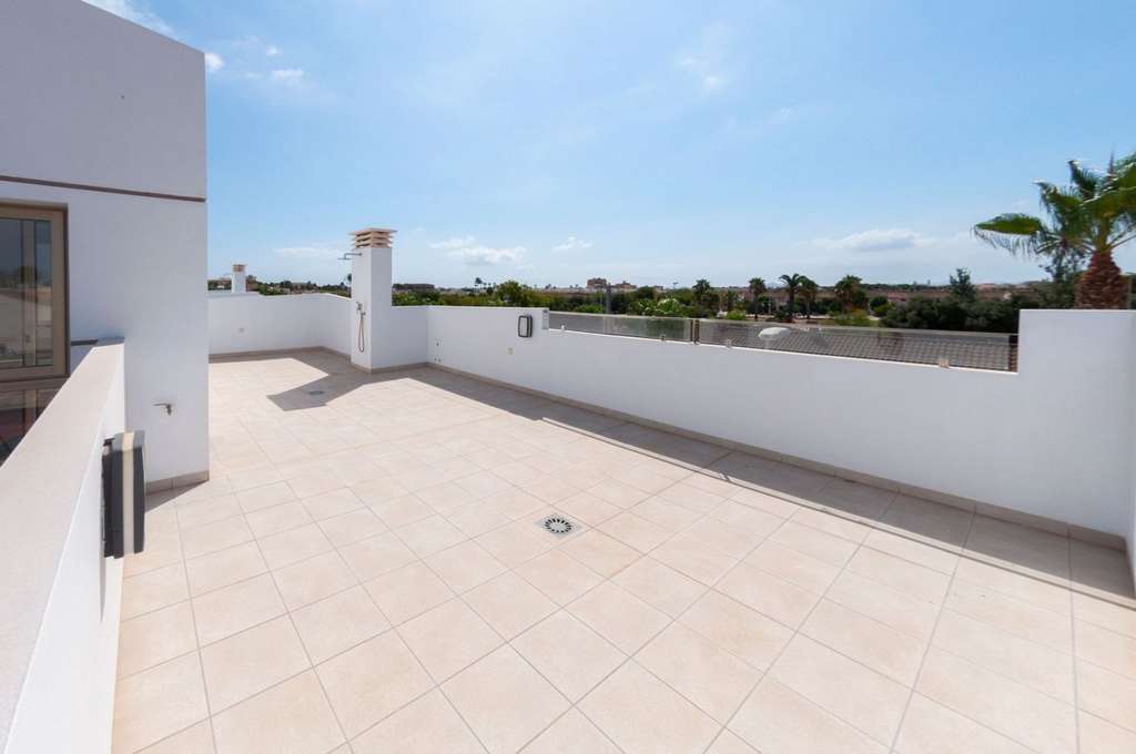 Esta villa diseñada con líneas rectas está construida en 2 plantas y contiene 3 dormitorios, 3 baños, cocina abierta con salón-comedor, solarium, jardín privado, piscina y plaza de aparcamiento.