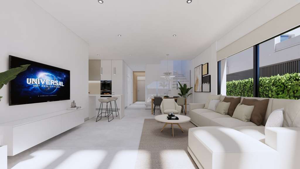 El interior de los adosados está cuidadosamente diseñado para ofrecer el máximo confort. Con una distribución que incluye 3 dormitorios y 3 baños, cada espacio está optimizado para la vida moderna. Los suelos de gres porcelánico aportan un toque de elegancia y durabilidad. Las propiedades están equipadas con aire acondicionado, persianas eléctricas y electrodomésticos, asegurando un ambiente cómodo y funcional. Los armarios empotrados ofrecen un almacenamiento eficiente, manteniendo los espacios ordenados y libres de desorden.