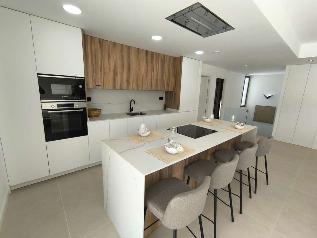 Disfruta de una piscina privada y un amplio solárium, perfectos para aprovechar el clima mediterráneo. La cocina de concepto abierto está equipada con encimera Neolith, fregadero bajo encimera y grifería monomando, integrada en un espacio moderno y funcional.