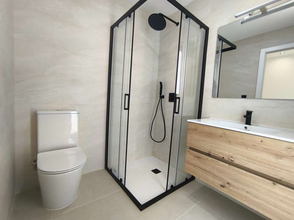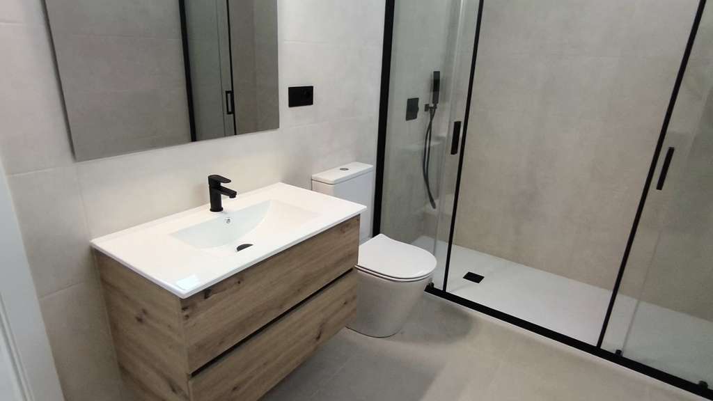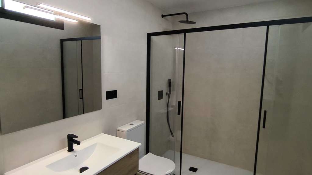 Baños con plato de ducha de resina, grifería negra empotrada y lavabo suspendido de porcelana.