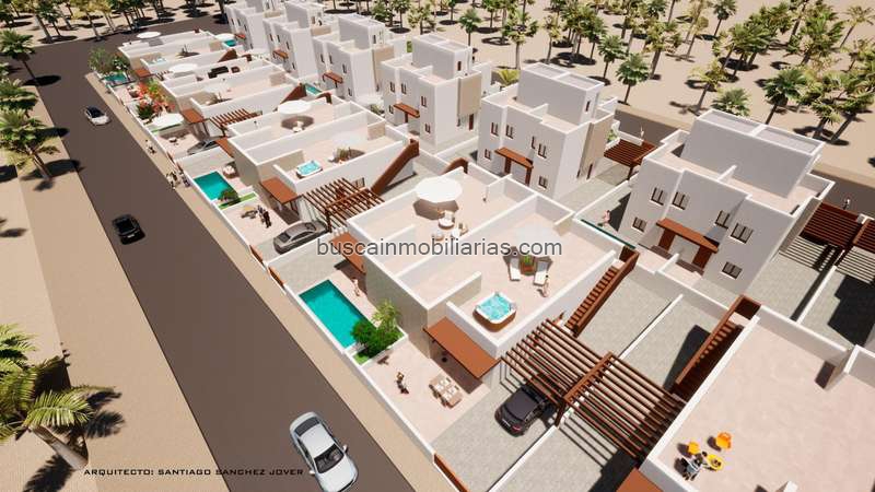 El interior de los adosados está diseñado para ofrecer confort y funcionalidad. Cada vivienda cuenta con tres dormitorios y dos baños, proporcionando un espacio adecuado para familias. Los armarios empotrados en los dormitorios optimizan el almacenamiento, mientras que la preinstalación de aire acondicionado asegura un ambiente agradable durante todo el año. El suelo de gres porcelánico añade un toque de elegancia y facilita el mantenimiento. Además, algunas viviendas incluyen jacuzzi, ofreciendo un extra de confort y lujo.