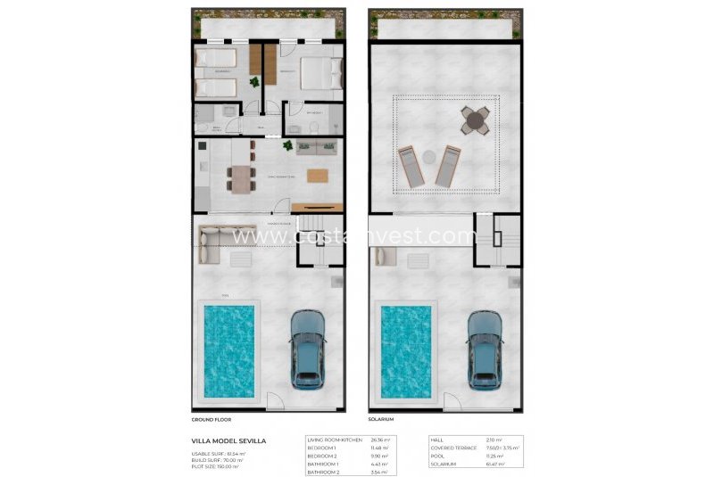 El modelo Sevilla ofrece una vivienda cómoda y luminosa con 2 dormitorios y 2 baños, ideal para quienes buscan privacidad y funcionalidad. El salón-comedor se abre al exterior gracias a un gran ventanal que conecta directamente con la piscina privada, creando una atmósfera relajante y moderna. Dispone también de solárium y aparcamiento en la parcela. Un hogar pensado para disfrutar del clima mediterráneo con estilo.