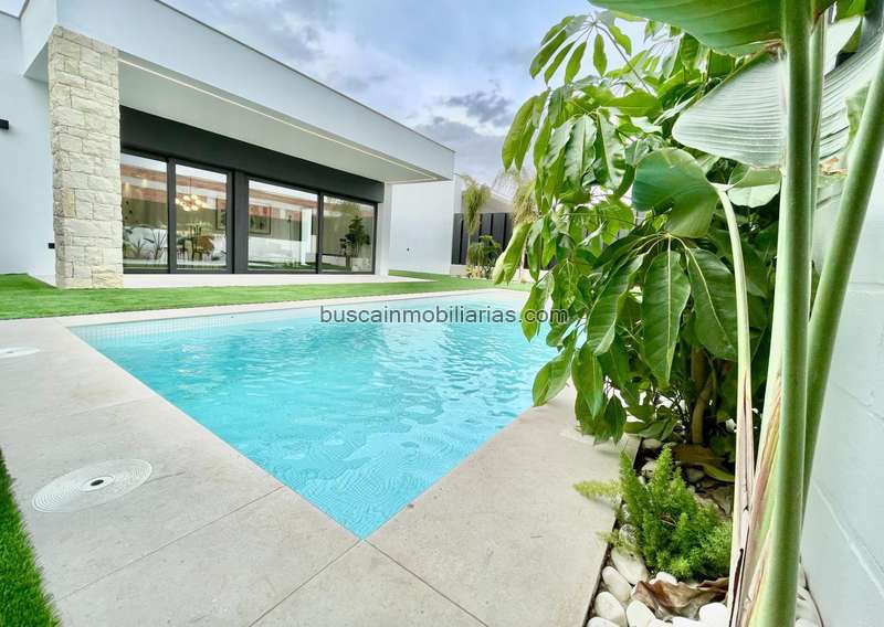 Villas de obra nueva de una sola planta con 3 dormitorios, 2 baños, cocina americana con amplio salón, armarios empotrados, terraza, jardín privado con piscina y plaza de aparcamiento.