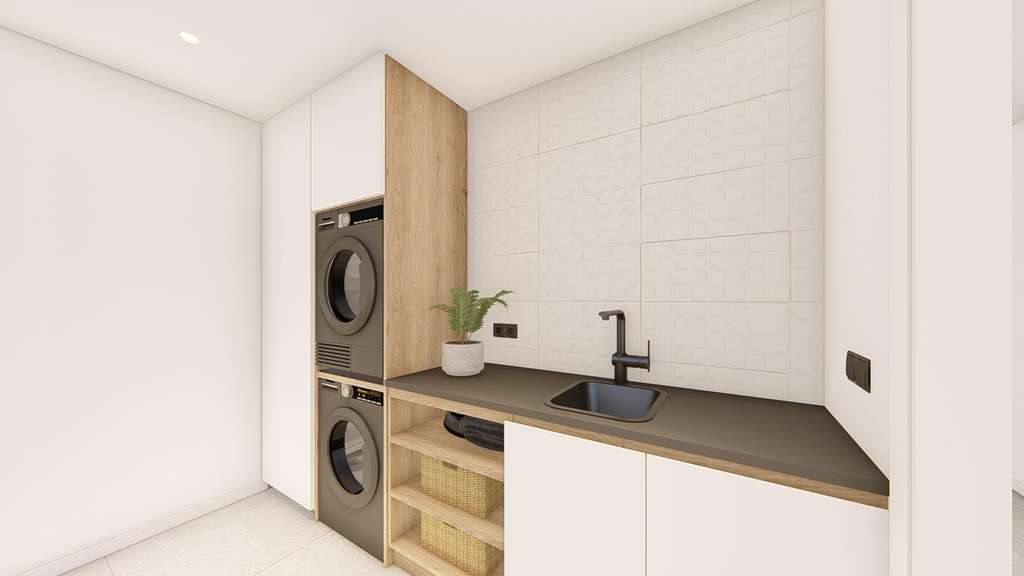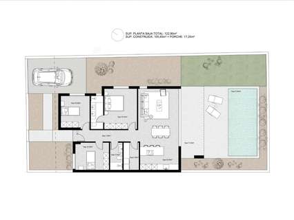 Villas de obra nueva de una sola planta con 3 dormitorios, 2 baños, cocina americana con amplio salón, armarios empotrados, terraza, jardín privado con piscina y plaza de aparcamiento.