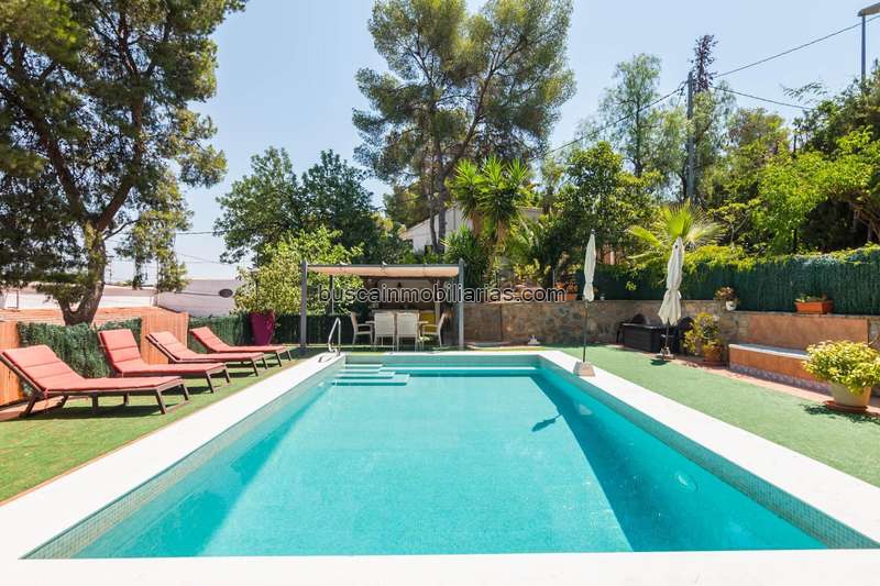 La parcela cuenta con 1.123 m2, la superficie construida es de 287 m2, la casa se distribuye en tres alturas. La planta baja es donde está situado el garaje y el trastero. En la planta intermedia tenemos dos habitaciones, un salón y un balcón amplio con vistas a Murcia. En la planta alta nos encontramos una terraza con una mesa para pasar tiempo con familia y amigos adornado con muchas plantes que le da un toque idílico, entramos a la casa y tenemos un salón – comedor con salida directa a un balcón colgante grande con vistas, una cocina bien equipada y espaciosa, 4 dormitorios y dos baños totalmente completos, en la parte oeste de la parcela hay un jardín bien cuidado donde está la piscina que es de gran tamaño, pegado a ella tenemos un chiringuito y una mesa con un toldo para protegernos del sol.