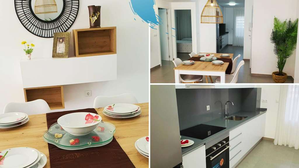 Las cocinas están equipadas con armarios altos y bajos en un elegante diseño blanco, con tiradores estilo gola. Incluyen un fregadero de un seno con escurridor, una placa vitrocerámica, un horno eléctrico y una campana extractora. Se ha preparado aire acondicionado (frío y calor) por conductos, con posibilidad de zonificar las estancias.