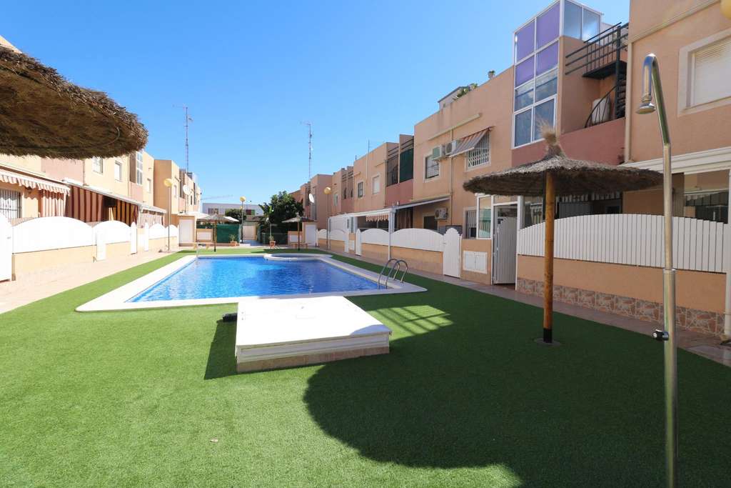 Bungalow Planta Baja en San Javier zona La Ribera, 70 m. de superficie, 50 m2 de terraza, 600 m. de la playa, 2 habitaciones dobles, un baño, propiedad en Buen estado, cocina equipada, orientación este.~Extras: armarios empotrados, muebles, piscina comunitaria, terraza, céntrico, costa, parques, supermercados, urbanización, parking incluido~