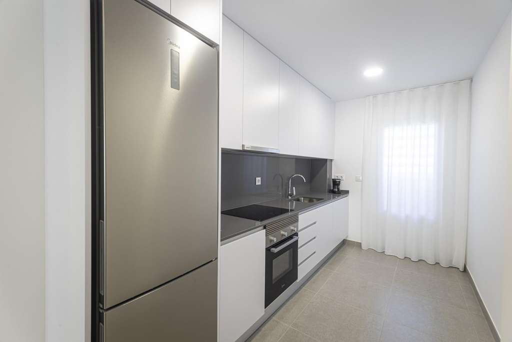 Cocina con mueble alto y bajo, en color blanco, tirador tipo gola, fregadero 1 seno con escurridor, vitrocerámica, horno eléctrico y campana extractora.