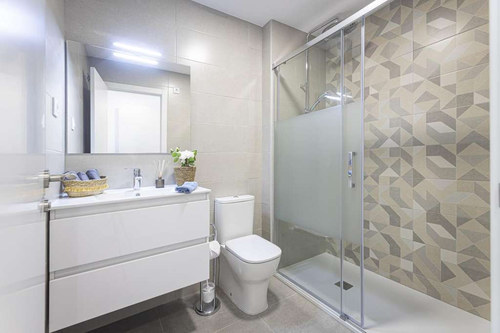 Apartamentos con puerta de entrada blindada y puertas lacadas en blanco con herrajes de acero inoxidable.