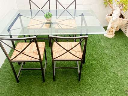 El salón espacioso y diáfano conecta con una terraza delantera ideal para desayunos al sol, mientras que en la parte trasera se encuentra un práctico lavadero. La cocina, completamente equipada y con tan solo ocho años de uso, se encuentra en excelente estado. Todas las estancias disponen de armarios empotrados forrados, puertas lacadas en blanco y suelos en terrazo y gres modernos.