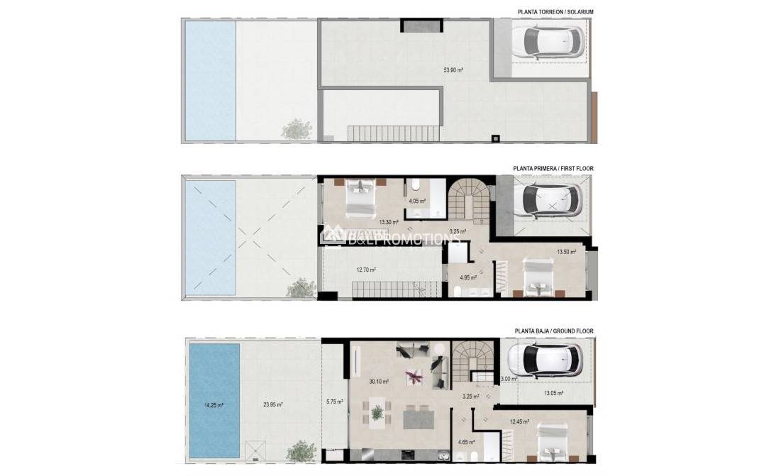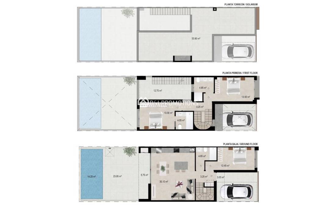 Cada vivienda ofrece 3 dormitorios y 3 baños, un amplio y luminoso salón con cocina abierta, y un diseño moderno con acabados de alta calidad. Además, podrás disfrutar del fantástico clima mediterráneo en tu piscina privada, en el amplio solárium ideal para relajarse o tomar el sol, y contarás con tu propia plaza de aparcamiento dentro de la parcela.