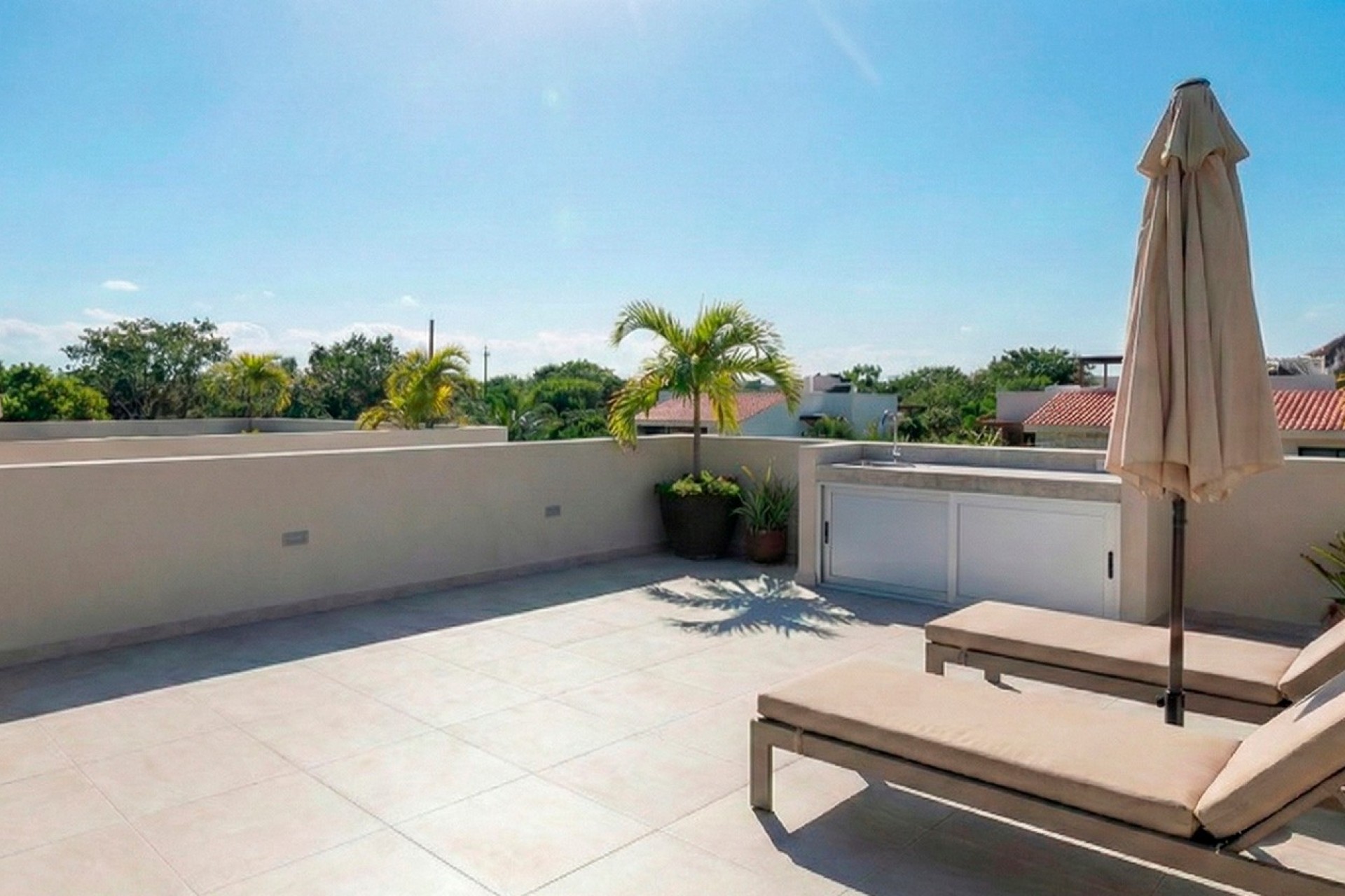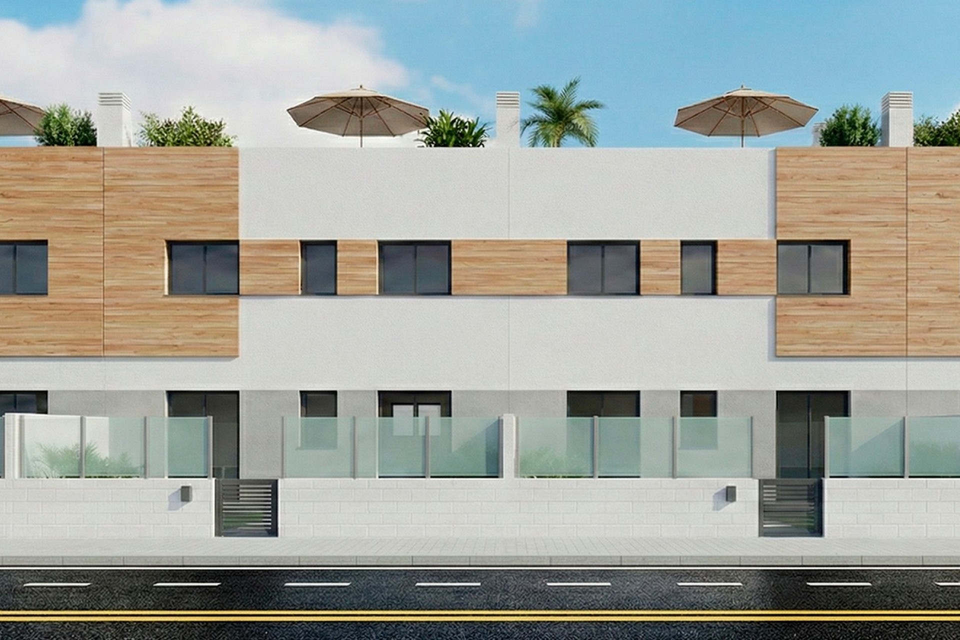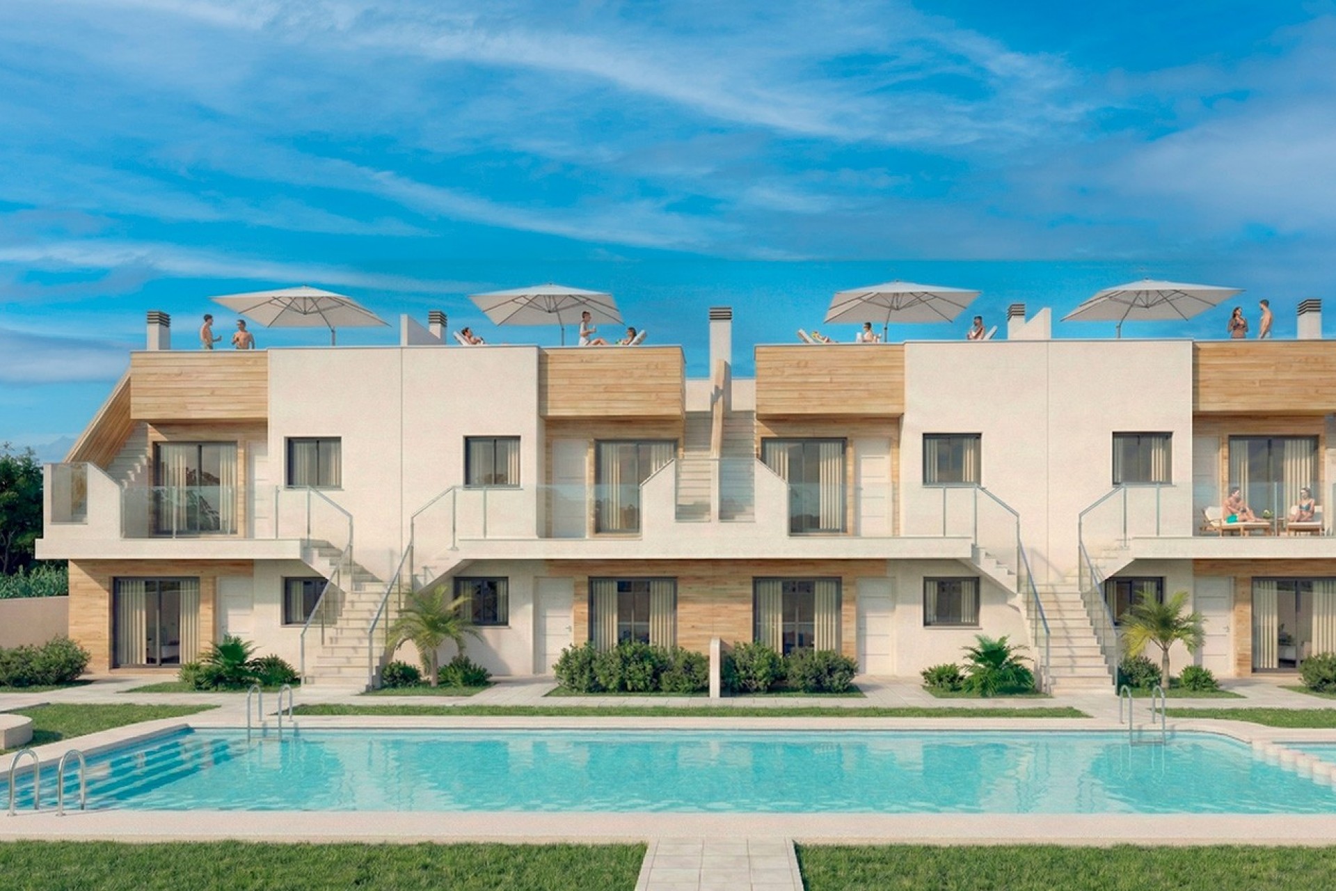 Por otro lado, las viviendas en planta superior disponen de 2 dormitorios y 2 baños, también con uno en suite, una terraza frontal y un amplio solárium privado con cocina de verano, perfecto para tomar el sol y disfrutar de la privacidad y las vistas abiertas.