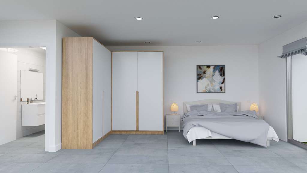 Las villas cuentan con tres cómodos dormitorios, cada uno con armarios empotrados completamente terminados con puertas giratorias. El dormitorio principal de 12,26 m² tiene un baño en suite de 3,97 m², mientras que los otros dos dormitorios de 10,06 m² y 8,73 m² respectivamente comparten baño. Gracias a los grandes ventanales con mecanismos correderos y basculantes, las habitaciones disfrutan de suficiente luz y ventilación. Conexiones de TV y teléfono están disponibles tanto en el salón como en los dormitorios.