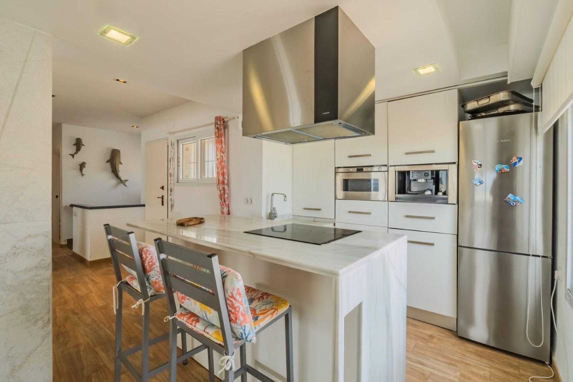 La planta alta, recientemente renovada con un diseño moderno, ofrece un gran salón con cocina abierta, una isla central de cocina, tres dormitorios y dos baños, uno de ellos en suite. Esta planta cuenta con suelos de baldosas y paredes de mármol de alta calidad. Desde el salón se accede a una impresionante terraza con vistas panorámicas al mar. En el exterior, la propiedad cuenta con una amplia parcela con su propia zona de barbacoa, donde podrá disfrutar de deliciosas cenas y disfrutar de la privacidad. Esta es una oportunidad única para poseer una vivienda exclusiva junto al mar, con un confort y un estilo excepcionales.