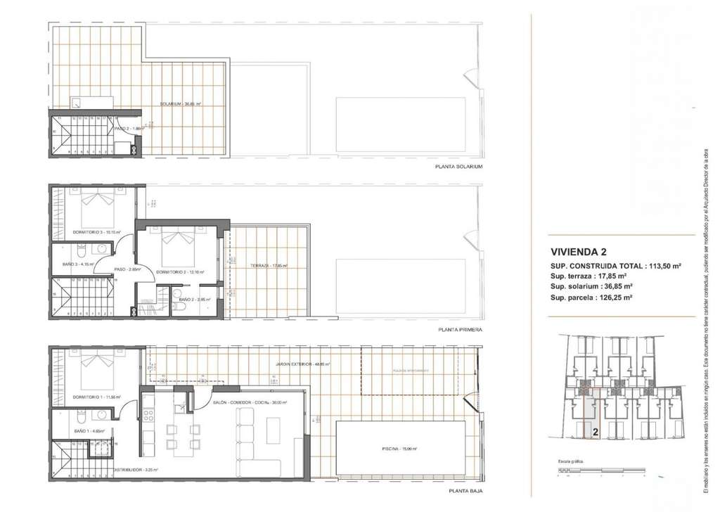 3 amplios dormitorios, incluyendo uno en la planta baja2 o 3 baños completos.Jardín privado y piscina.Terraza en la primera planta y algunas unidades con solárium en la azotea, ideal para tomar el sol o recibir invitados.Aparcamiento privado dentro de la parcela.Además, dos de las viviendas disponen de instalación de placas fotovoltaicas para el ahorro de energía.