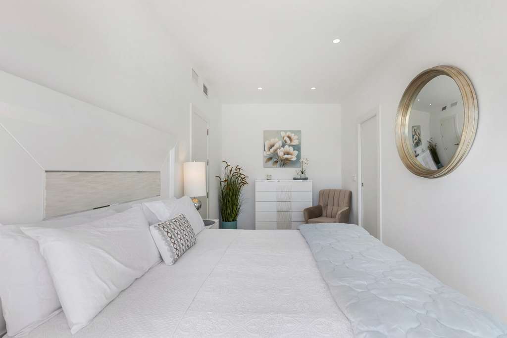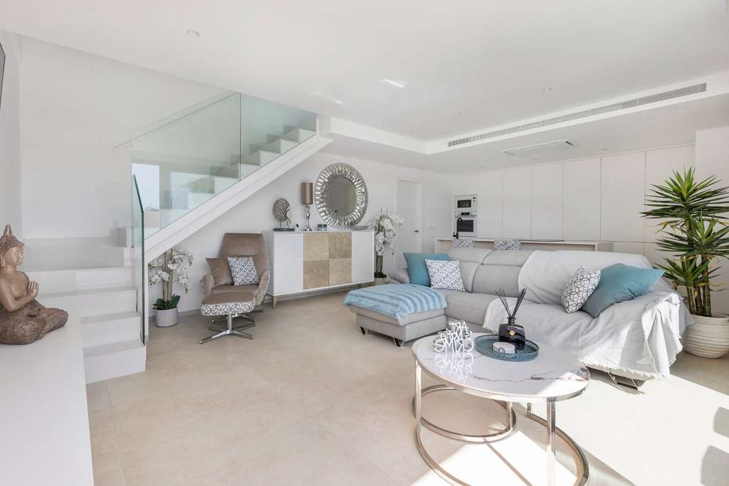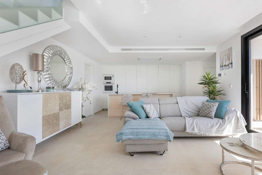 Las zonas de estar de estas villas tienen acabados elegantes y ofrecen acceso a una cocina moderna. Las cocinas están equipadas con armarios lacados de alto brillo y encimeras blancas. Incluyen fregadero de acero inoxidable, grifería monomando de ROCA® y electrodomésticos integrados como horno multifuncional, microondas, placa de inducción y campana extractora. Además, se incluyen todos los principales electrodomésticos de cocina TEKA®, incluidos frigorífico, lavavajillas, lavadora y secadora.