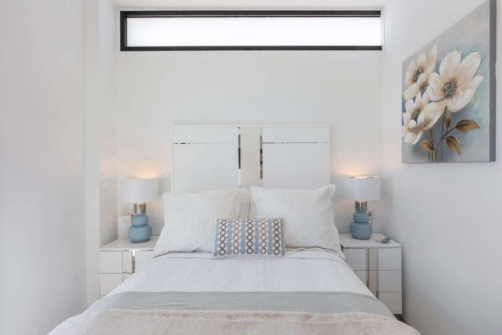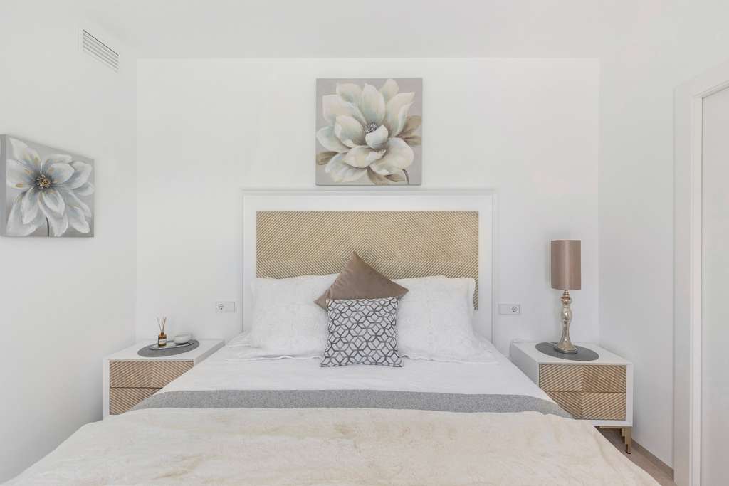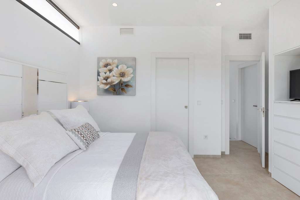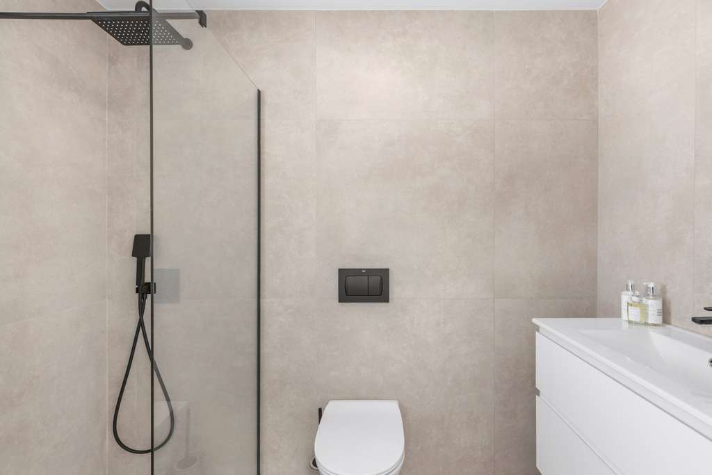 Los tres dormitorios disponen de armarios empotrados con acabados textiles, incluidos cajones, estanterías y barras para ropa. Los baños están lujosamente acabados con porcelánico blanco de ROCA®, platos de ducha extraplanos, mamparas de cristal y grifería ahorradora de agua. La iluminación LED en los techos y los materiales de alta calidad proporcionan una apariencia elegante.